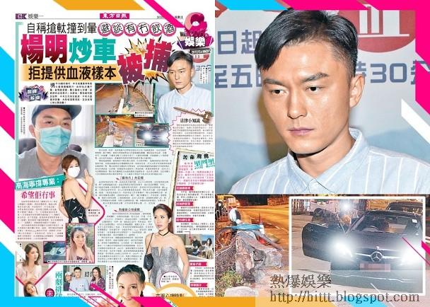 警員趕抵現場,發現肇事司機為藝人楊明(本名林明樂),他滿身酒氣步履不穩,並報稱不適,其後由救護車送往瑪麗醫院治理。現場消息指,其女友莊思明其後偕家姐莊思敏到場了解。警方指肇事司機當時身帶酒氣,意外後拒絕提供血液樣本作酒精測試,經初步調查後,以涉嫌「拒絕提供血液樣本」將他拘捕,現獲准保釋候查,須於9月上旬到警署報到。警方指有關調查交由港島總區交通部負責,定必秉公辦理,至於有關人士涉及警隊的宣傳活動將會暫停,已上載影片會視乎性質及內容再作適當安排。