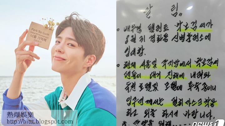 由於現時武漢肺炎肆虐韓國,朴寶劍的所屬事務所兩度發聲明,表示他將會低調入伍,不會公開其報到時間,呼籲fans保持社交距離,避免聚集在營區外令疫情擴散。不過今日網上流出一張寓所張貼的告示,聲稱朴寶劍的fans已從各地到達鎮海區,並入住寓所附近的民宿,呼籲居民外出時記得戴口罩,引起網民熱議。
