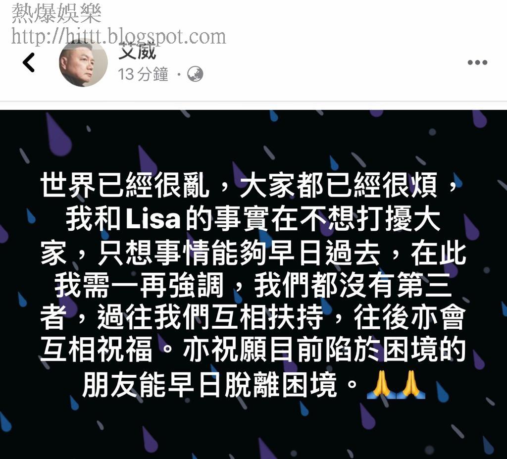 - 【失婚已經好傷】艾威fb出文力證分居不涉第三者 老婆Lisa朋友代回應:不捨18年感情