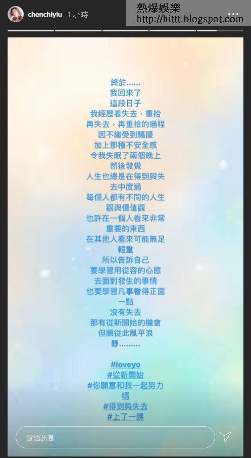 雖然Yoyo已經取回賬號,不過她之前在IG中貼出的所有靚相均已被删走,她指經過今次之後,需要學習用從容的心態去面對發生的事件外,亦要學習用良好的心態去對待事情:「學習凡事看得正面一點,沒有失去哪有從新開始的機會,但願從此風平浪靜……」而Yoyo之後更hashtag了「#從新開始」、「#你願意和我一起努力嗎」及「#上了一課」等。