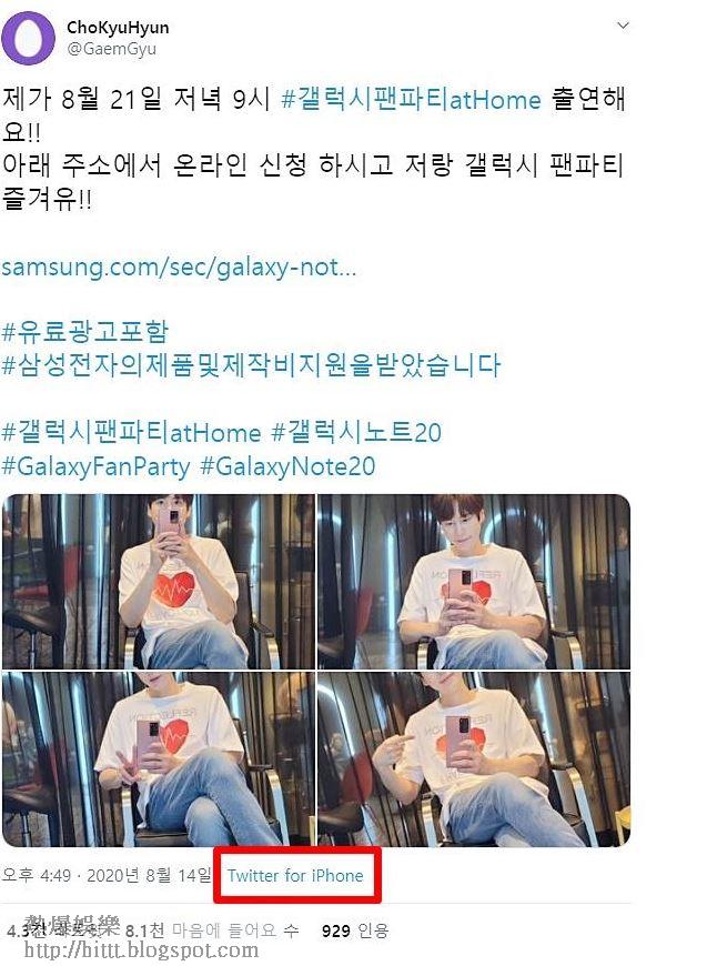 韓國男團Super Junior(SJ)的32歲圭賢爆出瘀事,他日前為三星宣傳新手機,並拍下多張自己拿着及試玩新手機的照片上載到Twitter,同時又預告會於來緊的周五參加品牌的活動。不過有眼利的網民就發現圭賢於Twitter的發文竟然是用iPhone發文,當中可見寫上「Twitter for iPhone」,即代表他雖然為三星宣傳,但自己卻使用 iPhone。