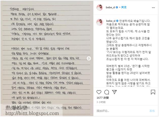 另外,曾演出韓片《夜關門:欲望之花》的33歲女星裴澀琪,今日在IG公開親筆信,宣佈閃婚拍拖3個月的細兩歲圈外男友,並公開了兩人的甜蜜婚照。裴澀琪還透露婚禮原定於下月25日低調舉行,不過目前疫情嚴峻,未確定會否延期。