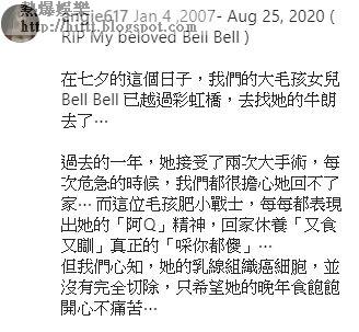 麥雅緻在IG寫道:「在七夕的這個日子,我們的大毛孩女兒Bell Bell 已越過彩虹橋,去找她的牛朗(郎)去了⋯過去的一年,她接受了兩次大手術,每次危急的時候,我們都很擔心她回不了家⋯ 而這位毛孩肥小戰士,每每都表現出牠的『阿Q』精神,回家休養『又食又瞓』真正的『睬你都儍』⋯但我們心知,她的乳線(腺)組織癌細胞,並沒有完全切除,只希望牠的晚年食飽飽開心不痛苦⋯」