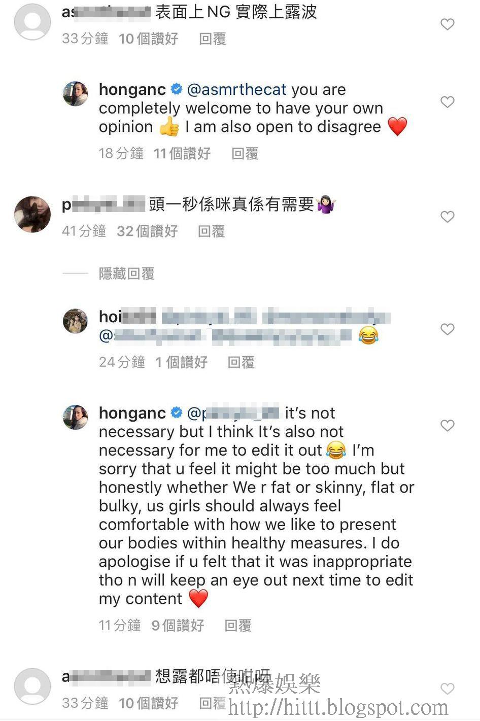不過網民仍質疑:「頭一秒(嗰個鏡頭)係咪真係有需要?」何雁詩答沒必要,但佢認為沒必要剪輯,自己只希望以健康方式展現自己的身體,該名網民解釋自己平時有留意何雁詩嘅post:「我都有睇開你,有like你啲post,不過今次真係覺得露多咗所以先留言,當然你咁fit有自信係好事,個人而言係over咗,可以ignore。」何雁詩亦向該網民道歉:「如果你認為這樣不合適,我深表歉意。唔緊要,我明白,我都尊重你意見同埋會留意返。」