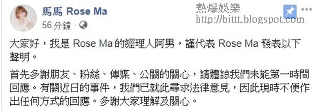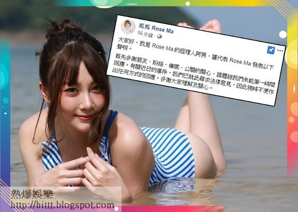 「電競女神」之稱的Rose Ma(馬俊怡)日前捲入床照風波,連日來都未有現身回應,今日終於蒲頭,她的經理人阿男在Rose Ma社交網代發聲明:「首先多謝朋友、粉絲、傳媒、公關的關心,請體諒我們未能第一時間回應。有關近日的事件,我們已就此尋求法律意見,因此現時不便作出任何方式的回應。多謝大家理解及關心。」