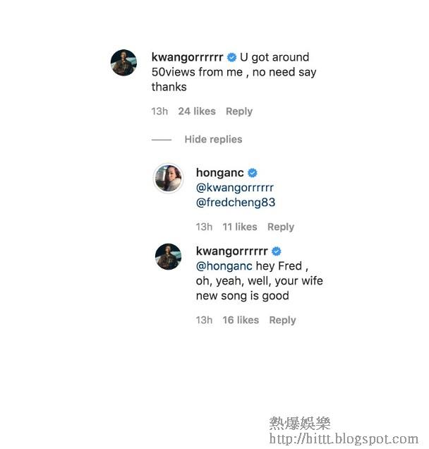 連出名係「溝女王」嘅吳業坤都忍唔住口花花留言:「我至少有50次點擊瀏覽,唔使多謝我。」何雁詩見狀即tag未婚夫,吳業坤就轉口風話:「Hey Fred,你老婆首新歌好好聽!」認真搞笑。同屬「巨聲幫」出身嘅佢哋咁老友,冇理由唔玩得嘅~