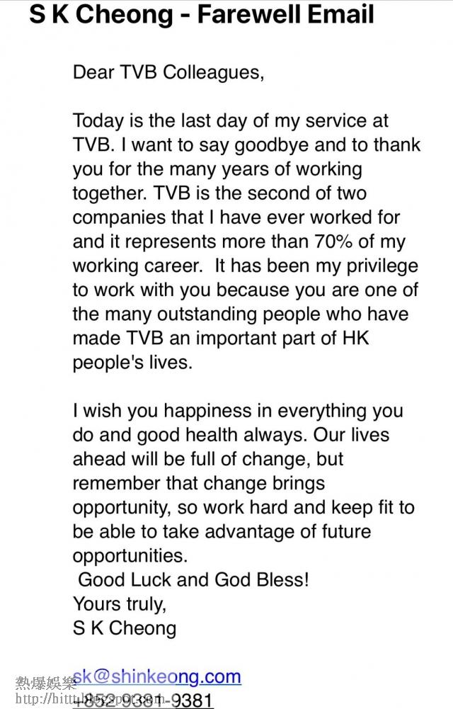無綫前總經理鄭善強去年底宣佈退休及辭任董事局執行董事職務,於今日1月1日生效,之前轉任董事局策略顧問至上月底,日前鄭善強向無綫員工發信道別,正式離開大台。