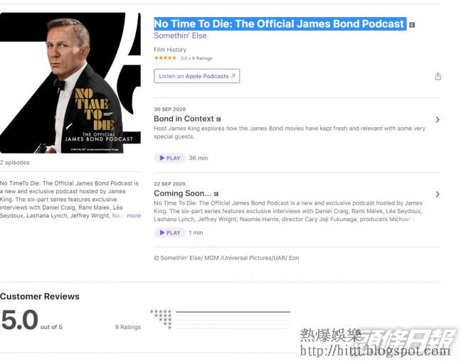 當中亦會講述不同國家地區的拍攝工作及高難度動作場面。另外,今次Podcast將會首次獨家播出部份Hans Zimmer為今次《007:生死有時》創作的電影音樂!一眾007系列電影的忠實粉絲,絕對不容錯過!