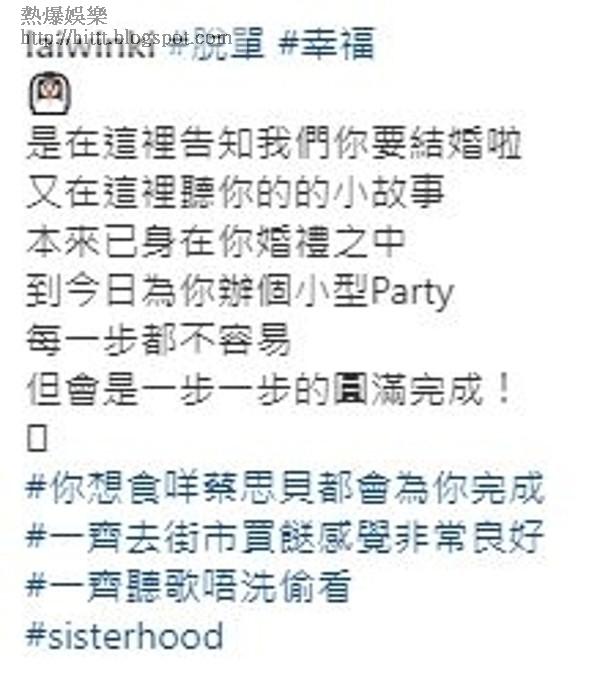 而賴慰玲就留言:「是在這裏告知我們你要結婚啦,又在這裏聽你的小故事,本來已身在你婚禮之中,到今日為你辦個小型Party,每一步都不容易,但會是一步一步的圓滿完成!」