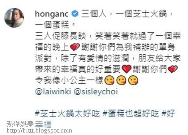 歌手何雁詩因疫情關係,同鄭俊弘(Fred)嘅婚禮受阻,雖然不似預期但係就獲好姊妹輪住送暖為佢開Party告別單身!尋晚就有蔡思貝及賴慰玲為佢買成10幾袋餸舉行Home Party慶祝「脫單」!何雁詩大晒合照,露出肚仔嘅佢左擁右抱,被幸福包圍,佢話:「三個人,一個芝士火鍋,一個蛋糕。三人促膝長談,笑着笑着就過了一個幸福的晚上💕謝謝你們為我補辦的單身派對,除了有愛情的滋潤,朋友給大家帶來的幸福真的好重要❤️謝謝你們💕令我像小公主一樣😘😘😘」