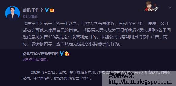 鹿晗的工作室在法院宣判後,轉發律師樓的微博,並提醒有肖像權相關的法律保護,呼籲切勿以身試法。