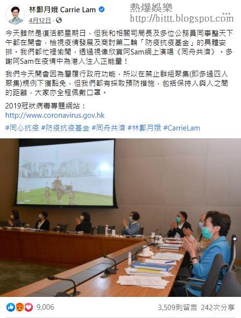 林鄭今年4月在FB呼籲大家擔定凳仔欣賞阿Sam演出,自稱開會忙裏偷閒。(網上截圖)