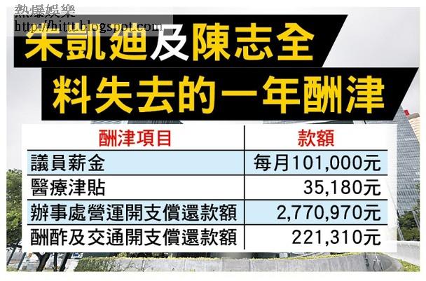 陳、朱兩人不續任議員,預料將失去逾四百萬港元酬津,當中包括薪金、醫療津貼、辦事處營運、酬酢及交通開支。按照一九年十月的議員酬津安排,現時議員每月的薪金約為十萬港元,一年則大約一百二十萬元;醫療津貼則每年有約三萬五千元。至於營運開支償還款額方面,辦事處營運每年最高可獲約二百七十七萬元;酬酢及交通則每年約二十二萬元。由於兩人已完成四年任期,可獲相等於任內所得薪酬的百分之十五,即大約七十萬元,他們亦可申領約二十三萬元結束辦事處開支償還款額。