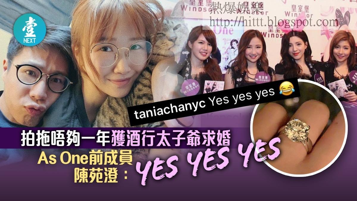 今年25歲的As One成員陳苑澄(Tania),曾參選2018年港姐,不過她的事業就不及愛情順利。和酒行太子爺拍拖未夠一年,便獲男友贈巨鑽求婚, Tania 在ig轉貼未婚夫Gary的貼文,相中大曬至少3卡鑽戒。她留言表示:「Yes yes yes」,接受求婚,準備做人妻。