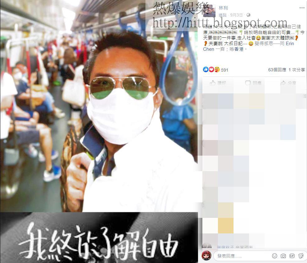 53歲自稱「大叔」的林利,最近由台灣返港,接受14日家居隔離後,日前在社交網開心宣佈:「今天出關,多了與媽團聚,也證明自己健康,終於明白能自由的可貴...今天要做的一件事,走入社會,謝謝太太體諒。夫妻說,大叔日記。」