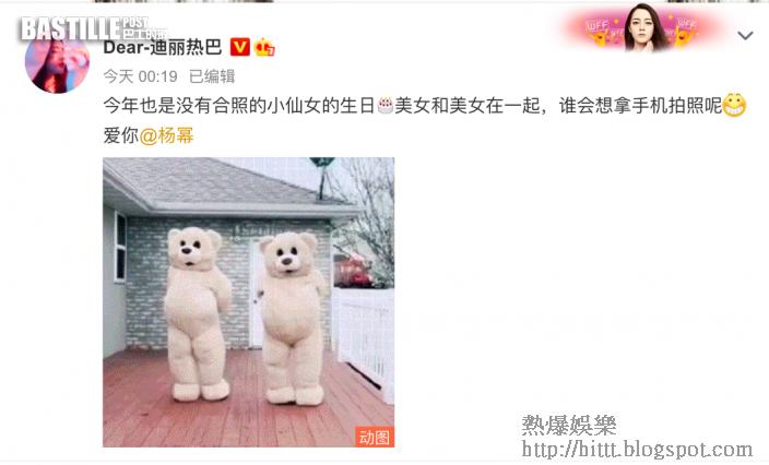 劉愷威前妻、大陸藝人楊冪今日34歲生日,旗下藝人迪麗熱巴連續6年踏正凌晨在微博留言祝老闆娘生日快樂,她說:「今年也是沒有合照的小仙女的生日,美女和美女 ...