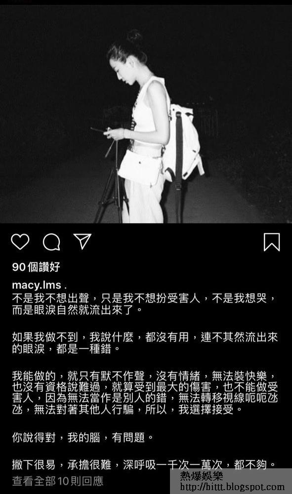 6月時Macy在IG貼了一張黑白相,更寫了一段傷心的文字:「不是我不想出聲,只是我不想扮受害人,不是我想哭,而是眼淚自然就流出來了。如果我做不到,我說什麼,都沒有用,連不期然流出來的眼淚,都是一種錯。