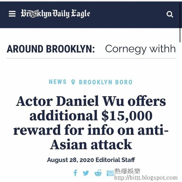 美國紐約市布魯克林區早前發生一名89歲只懂講廣東話嘅華裔老婦,被兩名蒙臉男子掌摑及於後背淋上煤油點火案件,男神吳彥祖(Daniel)決定出手懸紅15,000美元(約120,000港元)緝兇,而原先社區組織與同樣喺當地生活嘅歌手歐陽靖(MC Jin)已成立15,000美元獎勵基金,所以加埋懸賞已增加至30,000美元(約240,000港元)。