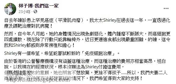 近月Shirley的病情未見好轉,日前子博在社交平台發起眾籌,希望為太太籌得醫藥費,接受新療法:「自今年八月起,她的身體情況出現急劇惡化,體內腫瘤不斷脹大,而癌細胞更四處擴散,現在除了行動只能靠輪椅外,近日更連進食都出現嚴重困難,的確,這令我和Shirley都感到非常徬徨和擔心!Shirley有一個希望,希望能嘗試較新的『免疫細胞治療』。」