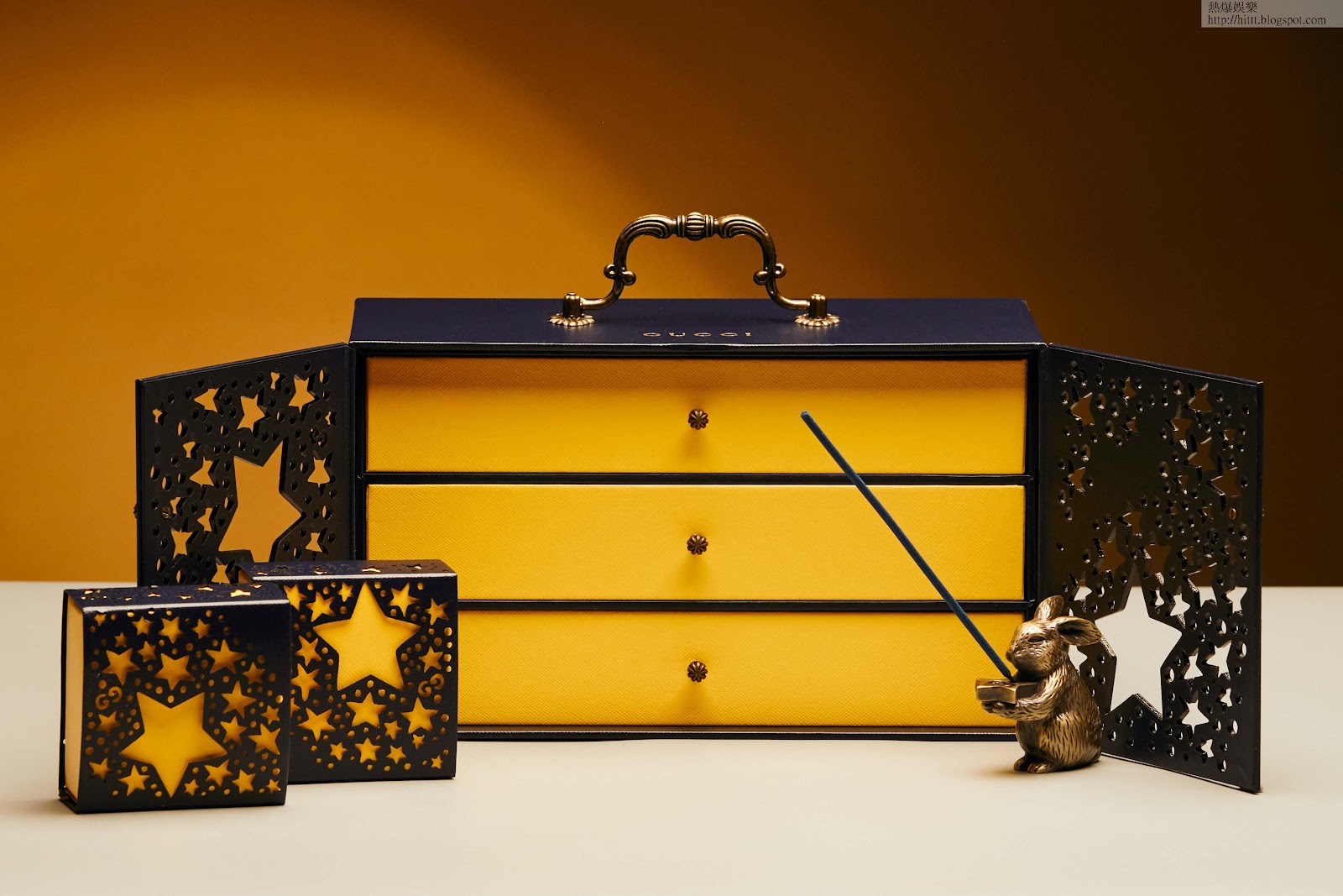 Gucci 所推出的寶箱月餅禮盒,木箱雕刻上鏤空的星形圖案,恍如首飾箱般雅緻,內附月餅、鐵製兔子插香座和線香,以香氣讓中秋佳節倍感愉快。