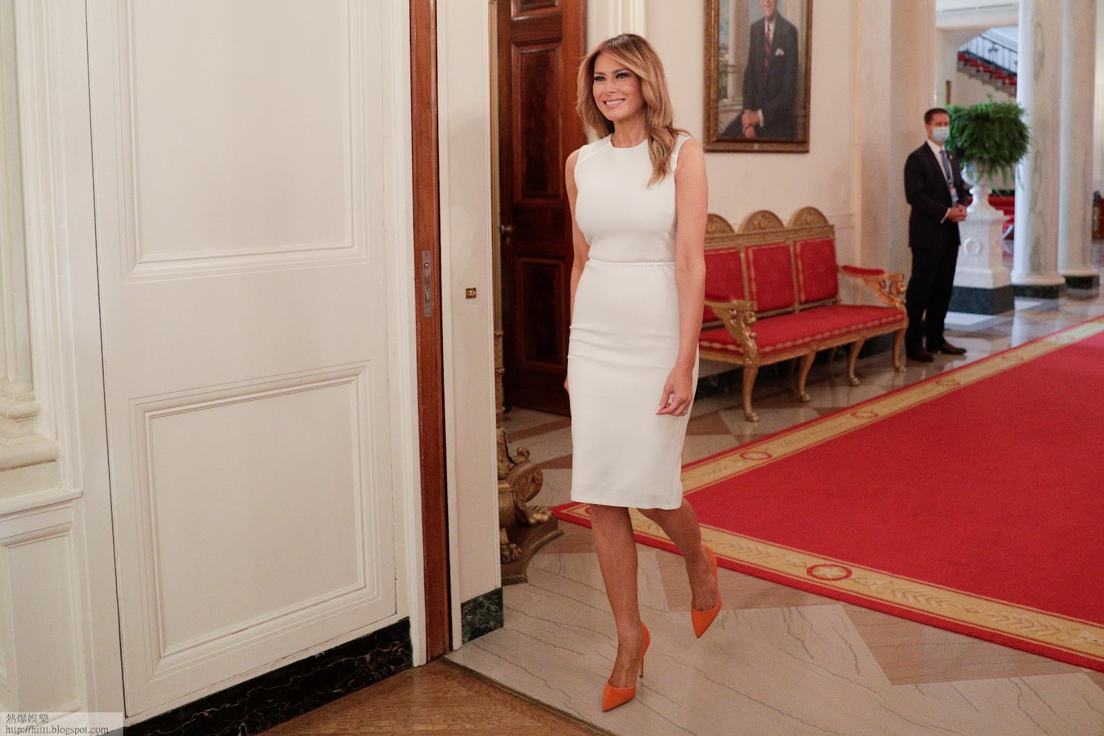 梅拉尼婭以Max Mara 白色連身裙現身,貼身的剪裁盡顯姣好身材,皮帶有畫龍點睛之效,腳踩愛牌Manolo Blahnik 的橙色麖皮高跟鞋,為全白造型帶來亮點。近年梅拉尼婭偏好簡約的首飾配搭,今次同樣只以戒指點綴,利落而嫵媚,值得讚賞。