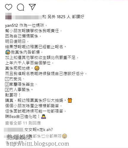 Yan在IG貼文自責:「作為一位媽咪,幫小朋友報讀學校係我嘅責任,因為自己懶惰關係,明日復明日,結果想報嘅幼稚園已經截止報名。我真係內疚到爆,加上知道其他學校收生額比例嚴重不足,上年六千人爭百幾個學位,真係黐黐哋線。而且我填報名表嘅時候發現自己應該好低分,冇受洗、家屬唔係舊生、冇人事關係。點算呀!講真,報幼稚園真係好似大抽獎。個個小朋友喺屋企樣樣都識答,但係面試嘅時候可能一句都唔答,睇Bea自己造化」對於Yan的自責,不少網民隨即與她分享經驗及報以安慰。