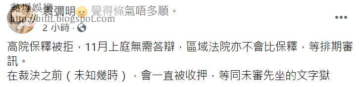快必戰友、人民力量前主席袁彌明今日素顏到庭外支持,獲悉快必未能保釋即忍不住淚灑庭外,袁彌明今日在FB留言:「高院保釋被拒,11月上庭毋須答辯,區域法院亦不會畀保釋,等排期審訊。在裁決之前(未知幾時),會一直被收押,等同未審先坐的文字獄。」袁彌明還表示為這個決定感到「條氣唔多順」。