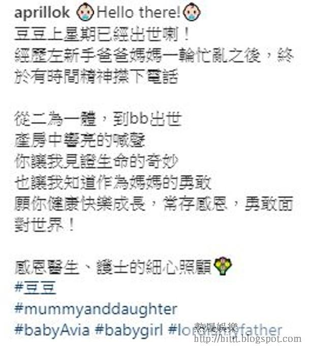 佢留言:「豆豆上星期已經出世喇!經歷左(咗)新手爸爸媽媽一輪忙亂之後,終於有時間精神㩒(撳)下(吓)電話,從二為一體,到bb出世,產房中響亮的喊聲,你讓我見證生命的奇妙,也讓我知道作為媽媽的勇敢。願你健康快樂成長,常存感恩,勇敢面對世界!」相中見「豆豆」眼耳口鼻標緻,頭髮濃密,長相似足媽咪一樣靚女。