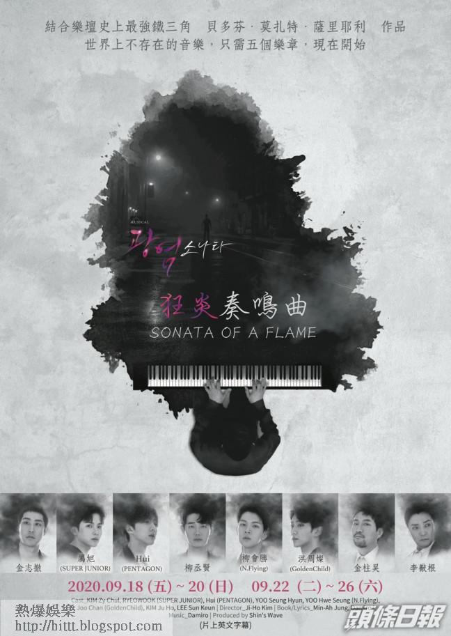 在「韓國文化院」獲得「2016表演藝術創意計劃—創作音樂劇優秀新作」,根據小說《狂炎奏鳴曲》改編而成的音樂舞台劇,將於2020年9月18至20日及9月22至26日在首爾公演,屆時香港的粉絲可與韓國同步於線上欣賞。該劇由金志撤、SUPERJUNIOR的厲旭、PENTAGON的Hui、柳丞賢、N.Flying的柳會勝、GoldenChild的洪周燦、金柱昊及李㪨根等傾力演出。