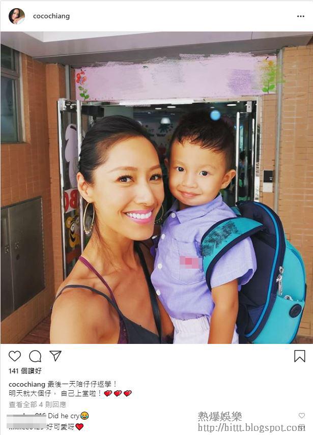 育有1仔1女的蔣怡,今天抱着兒子在幼稚園門外拍照留念,CoCo在IG貼文說:「最後一天陪仔仔返學﹗明天就大個仔,自己上堂啦﹗」