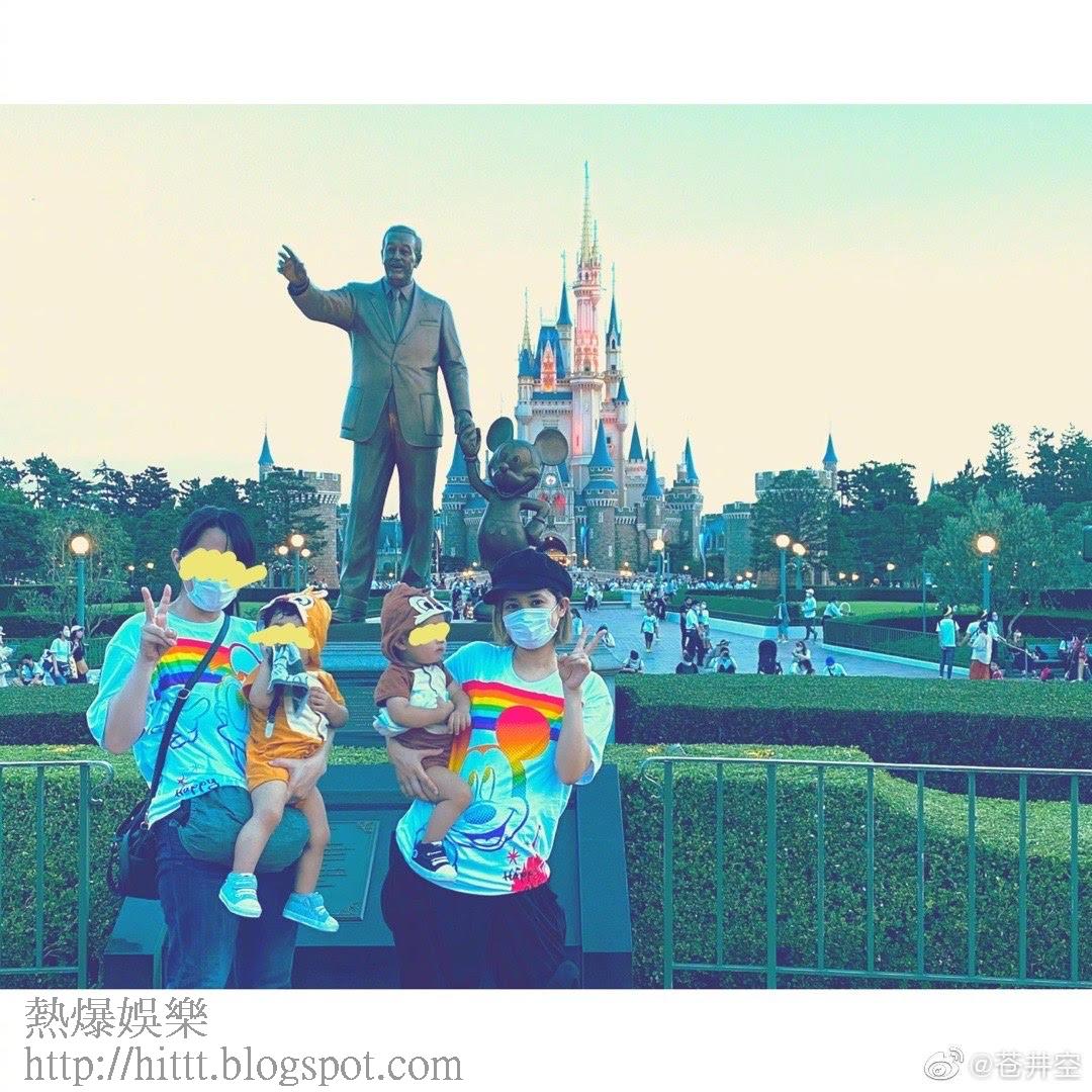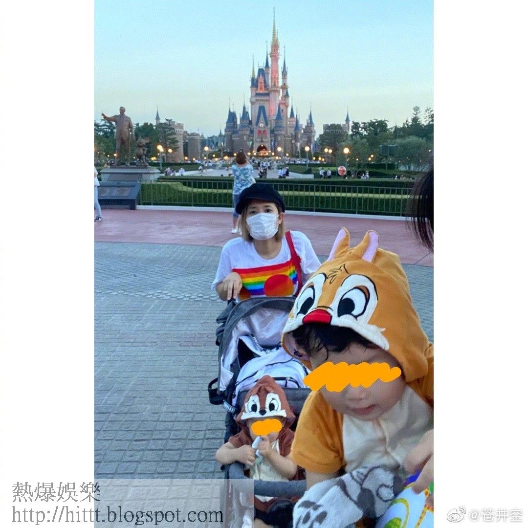 日本前AV女優蒼井空從良後做賢妻良母,她日前與胞妹帶住一對孖仔同遊東京迪士尼樂團,於日本網誌及中國微博分享是次照片,她把照片上載至微博時亦有用中文留言:「我出生後第一次去東京迪士尼樂園...」,原來她把「產後」寫錯「出生」,雖然她全程要戴上口罩,但仍大讚好玩,其雙胞胎已經一歲零四個月大,兩個囝囝齊穿上可愛公仔衫化身鋼牙奇奇與大鼻帝帝,但就有網民發現蒼井空上圍明顯縮水。