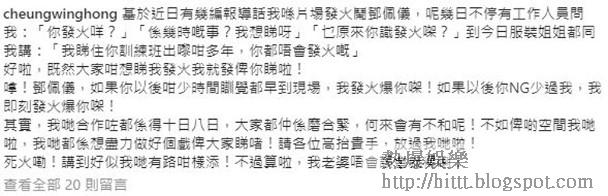 張頴康社交網全文:「基於近日有幾編報道話我喺片場發火鬧鄧佩儀,呢幾日不停有工作人員問我:『你發火咩?』『係幾時嘅事?我想睇呀』『乜原來你識發火㗎?』到今日服裝姐姐都同我講:『我睇住你訓練班出嚟咁多年,你都唔會發火嘅』
