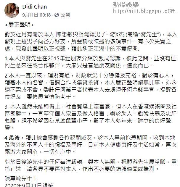 至於被陳惠敏父女指冒名招搖撞騙的游先生,大前日下午4時許,去到紅磡警署報案。他在警署外接受《蘋果》訪問時透露,已先後報了兩次警,他說︰「係涉及陳生屋企、佢個女嘅嘢。」問到涉及何事時,他沒有正面回應,只表示不想被人指是老千。至於Didi在facebook公開了一些關於游先生的WhatsApp對話截圖,顯示游先生欠款,和涉及不法活動時,他說︰「我諗呢啲嘢,佢哋可能專業過我囉,好多嘢我都唔明、唔清楚。」游生強調自己是台灣人,若在港從事不法活動,沒可能繼續在港逗留。當日他在警署內逗留約3小時後便離開。