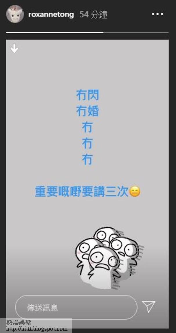 今日身為女主角嘅湯洛雯終於蒲頭喺社交網解釋,指自己仲未結婚:「冇閃,冇婚,冇冇冇,重要嘅嘢要講三次。」