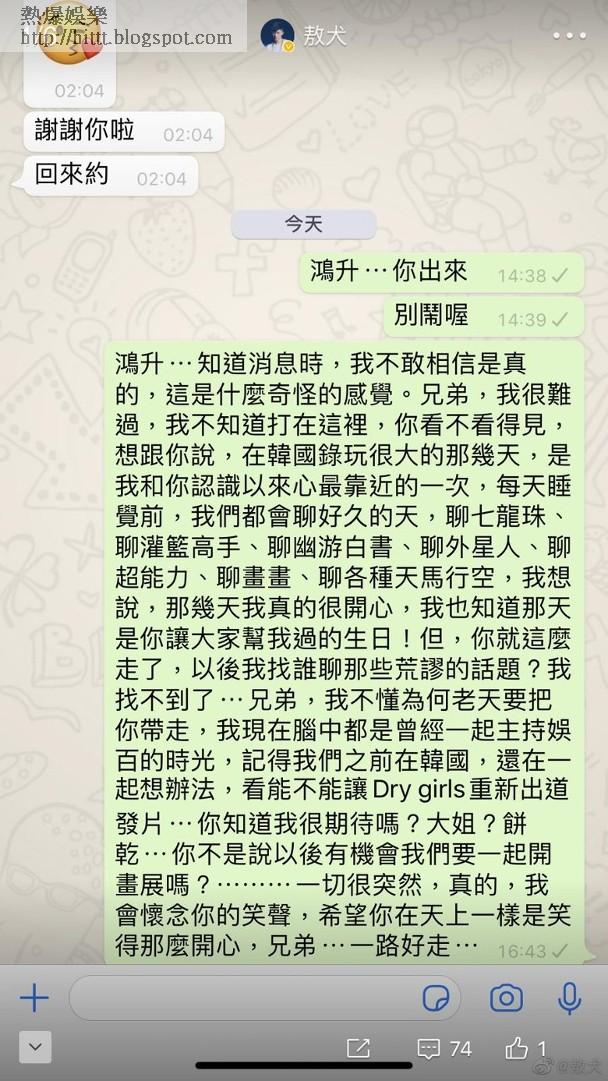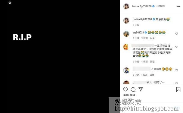 被爆與羅志祥有長期不正當男女關係的「蝴蝶姐姐」愷樂,潛水5個月後蒲頭發文悼念。而徐熙娣(小S)、陳妍希、賈靜雯與修杰楷亦有上載黑色畫面,留言表示無法接受。好友敖犬上載WhatsApp於社交網,見只有單剔,即對方沒有收到訊息,令人心傷!