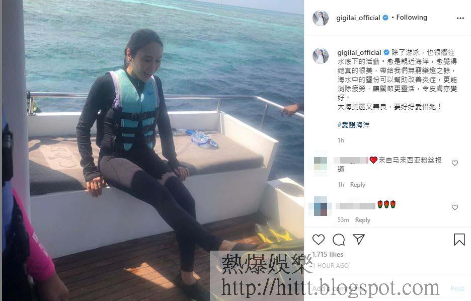黎姿今日就在社網站中上載了一張坐在遊艇上的照片,相中黎姿身穿全黑潛水衣加救生衣,望着自己腳上的蛙鞋笑,而黎姿身邊則放浮潛用的呼吸管及面鏡,估計她正要準備玩浮潛欣賞海底下的美景。黎姿留言表示自己好嚮往水底下的活動,更呼籲大家要好好愛惜海洋:「越是親近海洋,越覺得她真的很美,帶給我們無窮樂趣之餘,海水中的鹽份可以幫助改善炎症,更能消除疲勞,讓關節更靈活,令皮膚亦變好。大海美麗又善良,要好好愛惜她!」黎姿連浮潛都可以想到護膚,果然是美容公司CEO!