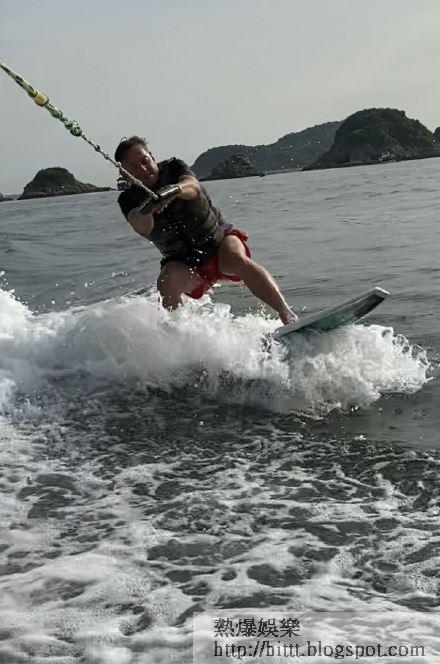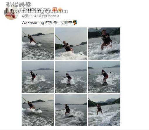 原來愛踢波的阿倫,在球場仍未開放下轉玩海上運動Wakesurf,昨晚深夜時份,阿倫在微博上載海邊自拍照,留言:「今天是我第一次接觸這一種玩意Wakesurfing」,而今早他再於微博上載了多張滑水相,留言:「Wakesurfing 的初哥=大鄉里」,相信是post昨日滑水照片,見他捉住繩索滑水,樣子看來有點吃力。不過阿倫已屆古稀之年,正所謂70歲骨頭脆,阿倫現在才學玩滑水,真的要小心扭親腰骨呢!