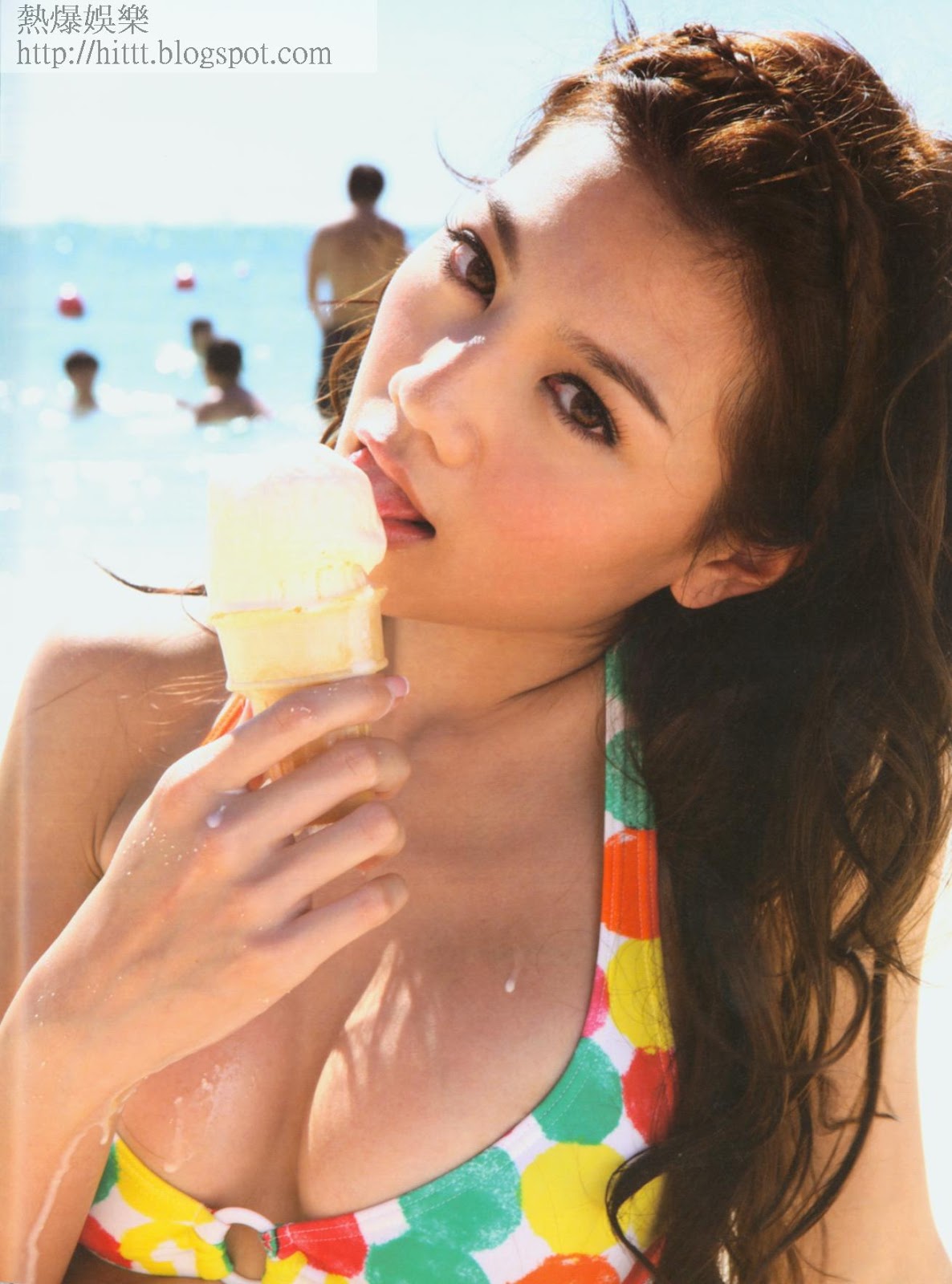 關嘉敏學周秀娜沙灘食雪糕。(蘋果日報)