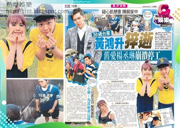 台灣歌手楊丞琳初戀男友兼藝人黃鴻升(小鬼)昨日驚爆死訊,他被父親發現半裸陳屍在台北北投家中,疑因心肌梗塞倒地失救致死,終年36歲。小鬼猝逝消息震驚中港台,楊丞琳更崩潰爆喊,情緒失控即時叫停所有工作,坦言認識對方是「這輩子的福氣」。