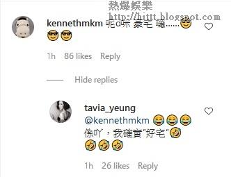 楊怡家中這個無敵海景,令人看到後心曠神怡,連馬國明都羨慕,留言:「呢d咪豪宅囉!」並加上個戴上黑超的emoji在後,暗示好曬!楊怡見到馬明的留言,立即回應對方:「係吖,我確實”好宅”!」,楊怡以「好宅」回應馬明的「豪宅」,明顯是腦筋急轉彎一族。