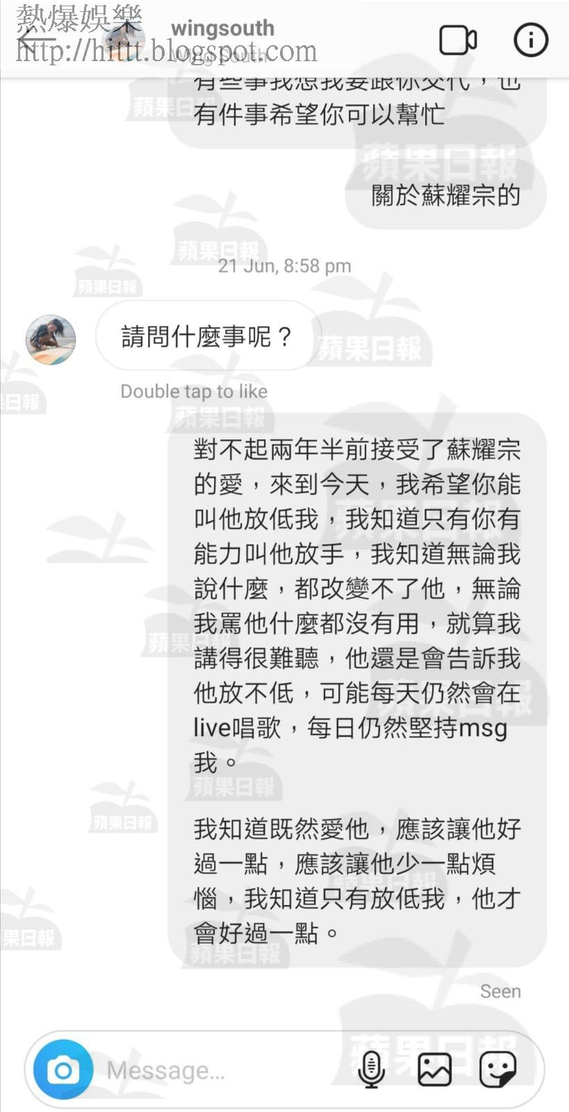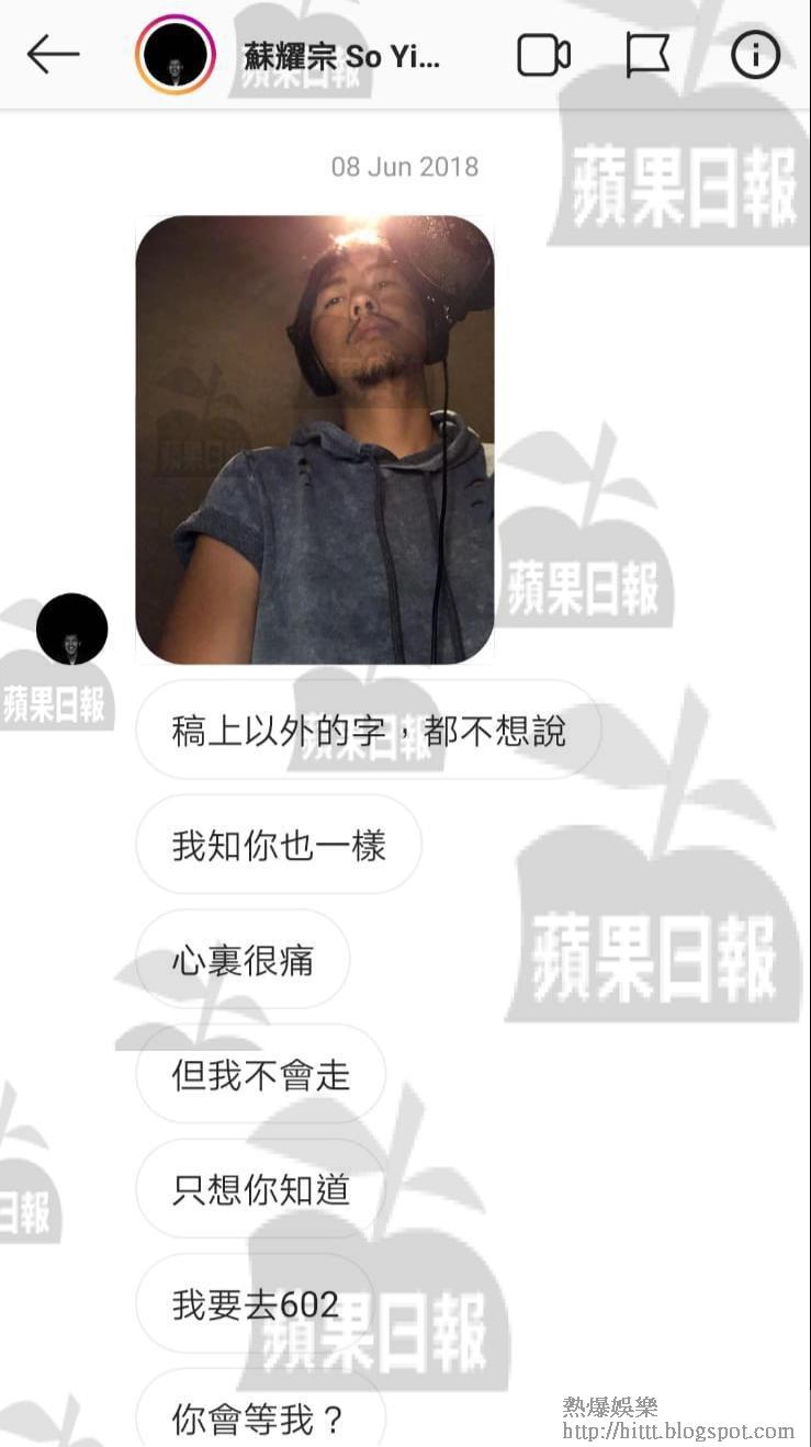 今年6月,阿B堅決跟細So斬纜,在IG私訊給蘇太爆大鑊:「對不起,兩年半前接受了蘇耀宗的愛,來到今天,我希望你能叫他放低我,我知道只有你有能力叫他放手,我知道無論我說甚麼,都改變不了他,無論我罵他甚麽都沒有用,就算我講得很難聽,他還是會告訴我他放不低,可能每天仍然會在live唱歌,每日仍然堅持msg我。我知道既然愛他,應該讓他好過一點,應該讓他少一點煩惱,我知道只要放低我,他才會好過一點。」