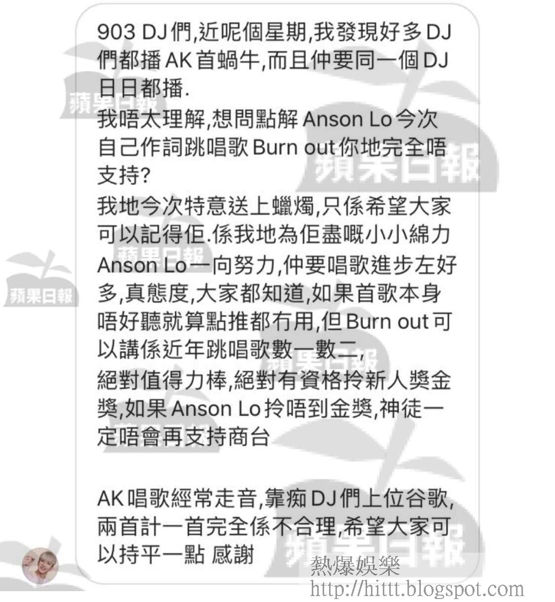 事隔4個月,有傳MIRROR fans又出動,今次就係成員盧瀚霆(Anson Lo)的歌迷。事緣DJ梁文禮昨晚以「粉絲行為.偶像埋單」為題出post,指903所有DJ,甚至連「Do姐」鄭裕玲都收到某歌迷的私訊,質問他們為甚麼收禮物後,不播放自己偶像的歌,更表示若支持的偶像在1月1日拿不到獎,就不會再支持商台。