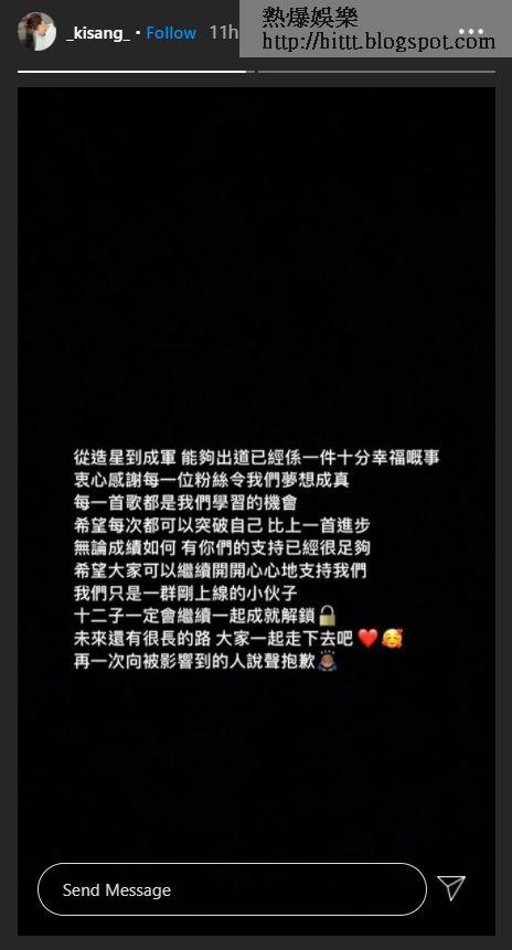Anson Lo因fans行為搞到要「埋單」,雖然未有道歉,不過他在IG story連環出post,表示有機會出歌已值得感恩:「其他的考慮或許看似重要,但其實都是其次。」至於無辜被牽連的Anson Kong,反而主動為受影響的人致歉。就此事,《蘋果》下午曾聯絡經理人花姐,但至今仍未有回應。