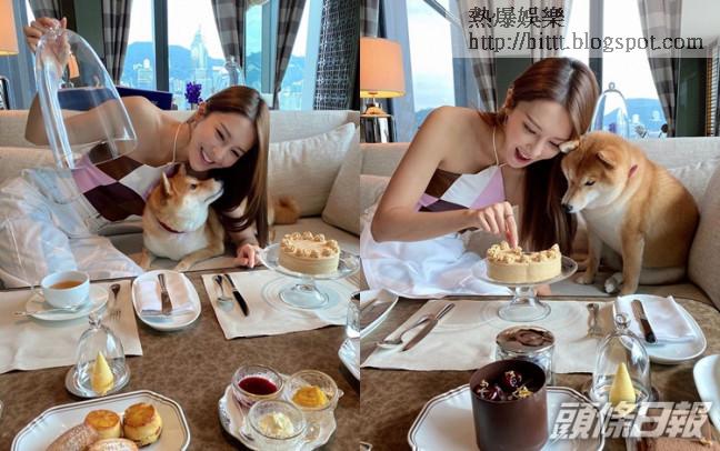 Kelly日前在酒店房跟狗狗齊做瑜伽,今日就換上靚靚露肩裝,與狗狗在酒店房歎High Tea,品嚐精美茶點,連狗狗都有特製的花生醬蛋糕。見狗狗吃到舐舐脷,Kelly也大感滿足,樂在其中。有網民留言「你的狗狗真幸福」。
