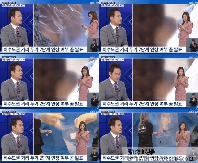 點知當直播畫面切換成左右兩邊時,電視畫面的左邊是記者,而右邊則是播出市民接受檢疫的場面,但此時右邊卻突然看到天氣主播金智孝走出來的場面,當時金智孝完全不知道正在直播,她更一邊甜笑一邊篤手機,並慢慢行入攝影棚裏,同時又可見有工作人員正準備為金智孝戴上口罩。