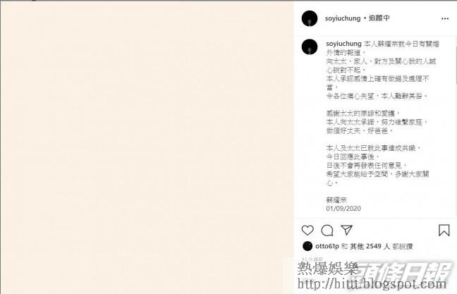 前商台DJ蘇耀宗(細So)昨日被爆背太太陳穎楠(阿Wing)偷食KOL「阿B」兩年半!對此,「潛水」一日的細So終於在深夜更新IG,他寫道:「本人蘇耀宗就今日有關婚外情的報道,向太太、家人、對方及關心我的人誠心說對不起。本人承認感情上確有做錯及處理不當,令各位痛心失望,本人難辭其咎。感謝太太的原諒和愛護,本人向太太承諾,努力維繫家庭,做個好丈夫、好爸爸。本人及太太已就此事達成共識,今日回應此事後,日後不會再發表任何意見,希望大家能給予空間,多謝大家關心。」