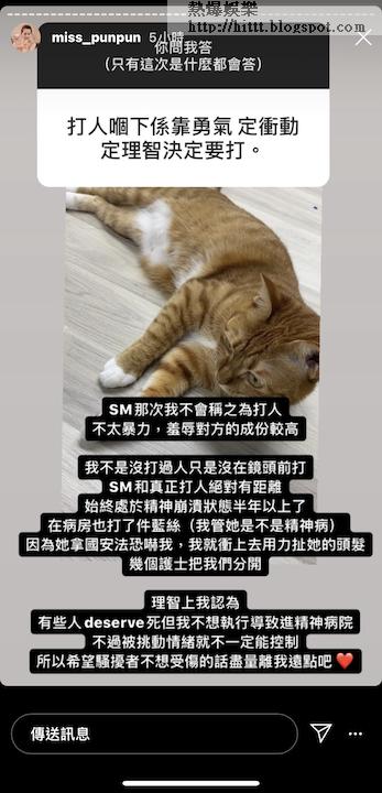 另外悔意就不會有的了,因為這年來的騷擾和被捕的陰影,搞到要看醫生吃藥,還進葵涌醫院精神病房,診斷為創傷後壓力失調症,所以有這樣的反應也很合理。我一向不是一個大愛的人,性格很孤僻,喜歡貓狗多於人,以前多次警告那些騷擾者不要再煩我,因為我也差不多被搞到精神病(IG的followers應該有印象我說過很多次),結果還是有人咎由自取,我也沒辦法。其實在葵涌醫院我也打了一個女精神病人,因為她已連續兩日不斷騷擾和拿政治的東西來刺激我,不過結果是她被關起來了,因為是她先騷擾。我竟然要做精神病人才能得到公平對待。😂