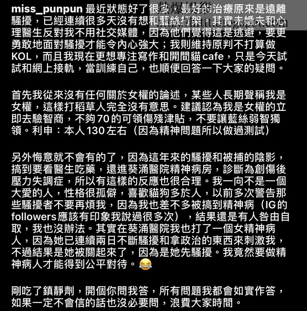 不過,Miss Pun「結業」不足半個月,就再次在instagram中發表「復出」宣言,更表示未婚夫和心理醫生反對她不用社交媒體,因為他們覺得這是逃避,要更勇敢地面對騷擾才能令內心強大,所以Miss Pun試試和網上接軌,當訓練自己也順便回答一下大家的疑問。另外,Miss Pun亦重申自己對自己所做的事沒有悔意,都是別人咎由自取,自己也沒辦法。最後更向網民大爆自己剛吃了鎮靜劑,會在instagram中開個你問我答,所有問題Miss Pun都會如實作答:
