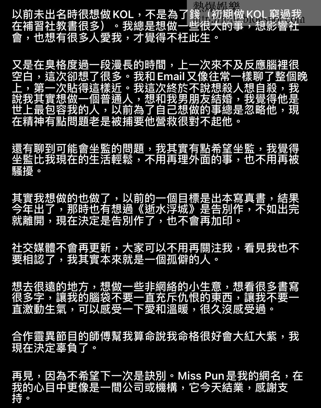 事件發生數天後,Miss Pun再次發文,更表示「Miss Pun結業了」決定永久退出網絡工作,而且之後亦不會再更新社交媒體,而好友Emilia是因為幫她才會一起被捕,希望大家不要怪責她。至於永久退出網絡工作是深個人思熟慮的決定,不是因為害怕甚麼,而是因為這樣的工作已嚴重影響她的心理健康。「想做一個普通人,想和男朋友結婚」,因她覺得男友是世上最包容她的人,她的社交媒體不會再更新,大家「看見我也不要相認了」,但她感謝網民一直以來的支持。