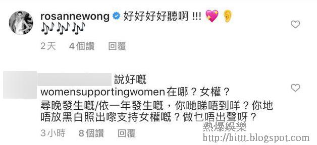 另外,組合2R出身的黃婉君(Rosanne),亦被網民在其IG留言問她「說好嘅womensupportingwomen在哪?女權?噚晚發生嘅、呢一年發生嘅,你哋睇唔到咩?你哋唔放黑白照出嚟支持女權嘅?做乜唔出聲呀?」早已淡出娛樂圈、安心做牙醫太太的Rosanne索性刪走整個post,避免被問到口啞啞。